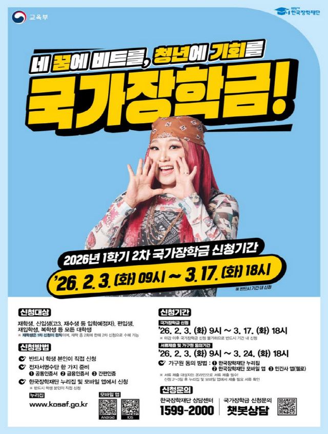 국가장학금 신청 기간은 다음 달 17일 오후 6시까지다. 신청 기간 중에는 한국장학재단 홈페이지나 한국장학재단 앱에서 24시간 신청 가능하다.