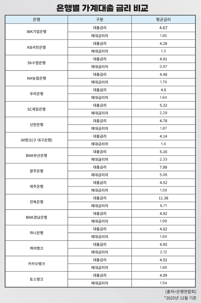 금융권에서는 중·저신용자 대출 비중이 높을수록 금리가 높아질 수는 있지만 동일한 영업 환경에 놓인 다른 지방은행들과의 격차까지 설명하기는 어렵다는 지적이 나온다. 예대금리차가 은행의 리스크 관리 수준과 영업 전략을 반영하는 지표라는 점에서 JB금융 계열 은행의 수익 구조가 지나치게 대출자 부담에 의존하고 있다는 분석이다.