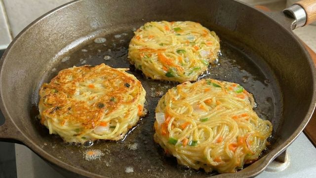 삶은 국수가 남으면 계란과 채소로 반죽해 전으로 해먹을 수 있다. AI로 생성한 자료사진.