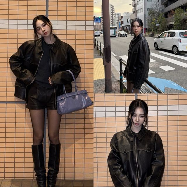 공개된 사진 속 카리나는 블랙 레더 재킷과 쇼츠를 매치한 스타일링으로 도회적인 분위기를 완성했다. 오버핏 가죽 재킷은 어깨선을 강조하며 특유의 냉정한 카리스마를 배가했고, 쇼츠와 시어한 스타킹, 롱부츠 조합은 슬림한 실루엣을 더욱 부각했다.