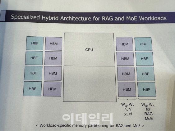 이날 김 교수는 HBF를 활용한 차세대 메모리 아키텍처를 공개했다. GPU 양옆에 각각 4개의 HBM과 HBF를 붙여 총 96기가바이트(GB)의 HBM 용량과 2테라바이트(TB)의 HBF 용량을 갖춘 아키텍처를 비롯해 각각 8개의 HBM·HBF가 두 줄씩 붙어 더 많은 용량을 처리할 수 있는 구조 등을 제시했다.