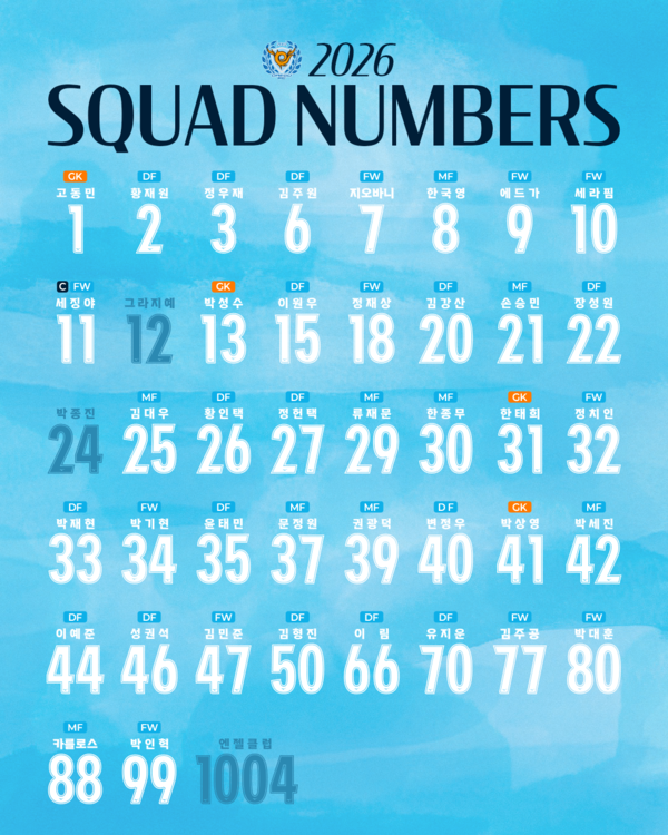 이번 시즌 대구 유니폼을 처음 입게 된 새 얼굴들도 자신만의 번호를 선택했다. K리그를 대표하는 미드필더 한국영은 중원의 중심을 의미하는 8번을 달고 그라운드에 나서며, 박인혁은 강렬한 에너지를 드러내는 99번을 택했다. 김대우(25번), 황인택(26번)도 새로운 등번호로 팀에 빠르게 녹아들며 새 출발을 준비 중이다.