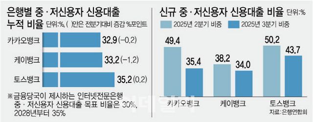 실제로 고강도 가계대출 규제가 본격화된 지난해 2분기 이후 신규 대출에서도 중·저신용자 비중 축소 흐름이 뚜렷하다. 카카오뱅크는 2분기 49.4%에서 3분기 35.4%로 급감했고, 케이뱅크는 38.2%에서 34%로, 토스뱅크는 50.2%에서 43.7%로 각각 낮아졌다.