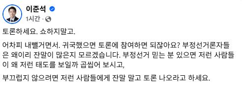 3일 이 대표는 자신의 페이스북에 “토론하세요, 쇼하지 말고. 어차피 내뺄거면서”라며 “귀국했으면 토론에 참여하면 되지 않느냐, 부정선거론자들은 왜 이리 잔말이 많은지 모르겠다”고 전씨를 겨냥했다.
