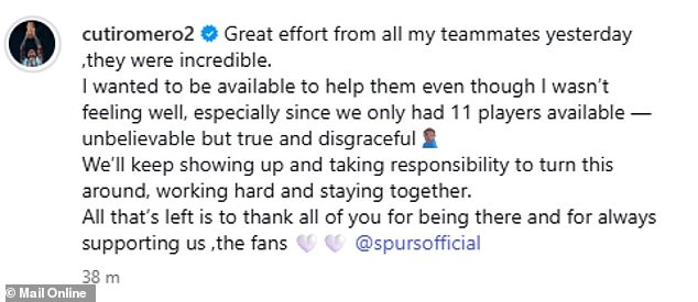 영국 데일리메일은 3일(한국시간) "로메로는 토트넘의 '수치스러운' 영입 전략을 비판하며, 맨체스터 시티와의 경기에 투입할 수 있는 선수가 단 11명뿐이었다고 주장했다"고 보도했다.
