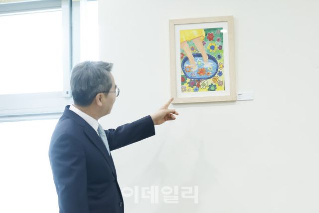 이같은 생각은 그의 집무실 풍경도 바꿔놨다. 평소 집이나 사무실에 액자 등을 걸어놓는 걸 싫어하던 김 지사는 태어나서 처음으로 돈을 주고 산 그림을 집무실 책상 앞 벽에 걸어뒀다. 물이 담겨 있는 대야에 치마를 입은 인물이 발 담그고 있는 모습의 그림 배경은 알록달록한 꽃들로 채워졌다. 돈을 주고 샀다기에는 다소 서툰 솜씨다.