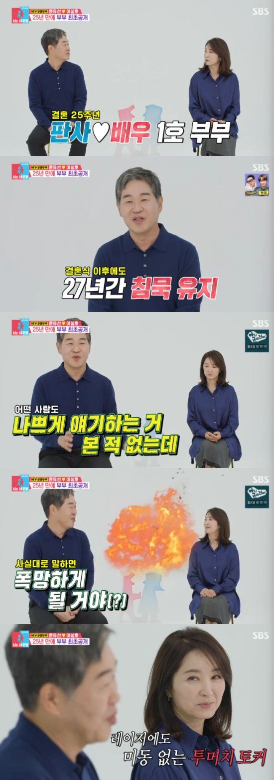 이날 방송에서 윤유선♥이성호는 27년만에 부부 예능에 출연하게 된 소감을 전했다. 윤유선은 "결혼 후에 인터뷰 요청이 많았는데, 남편이 공직자 신분이라 안 하다가 이제 하려니까 어색하다. 제가 데뷔하는 느낌"이라고 긴장했다.