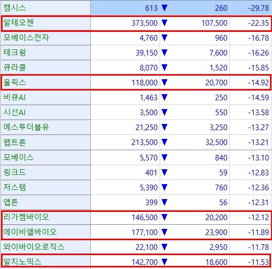 유독 하락률이 컸던 바이오텍들은 모두 빅파마에 1건 이상의 기술수출 성과를 기록한 곳들로 코스닥 바이오증시를 이끌던 대장주였다. 이슈의 당사자였던 알테오젠을 제외하고 21일 바이오 대장주들의 주가 하락률은 △올릭스(226950) -14.92% △리가켐바이오(141080) -12.12% △에이비엘바이오(298380)(ABL바이오) -11.89% △알지노믹스(476830) -11.53% 순으로 나타났다.