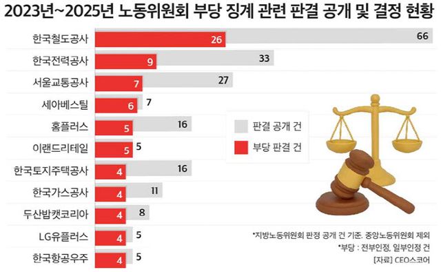 4일 기업데이터연구소 CEO스코어가 매출 기준 500대 기업 중 조사 가능한 259개사를 대상으로 2023~2025년 노동위원회 판결을 분석한 결과, 공개된 697건 가운데 172건(24.7%)이 부당 판정을 받았다. 전체 부당 판결의 30% 이상이 공기업에서 발생했다.