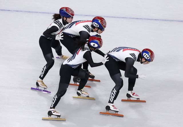 이탈리아 밀라노 아이스스케이팅 아레나에서 대한민국 쇼트트랙이 계주 훈련을 하고 있다. / 뉴스1