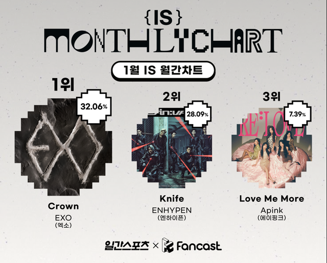 그룹 엑소가 1월 팬캐스트×일간스포츠 ‘IS 월간 차트’에서 신곡 ‘크라운’으로 종합 1위에 올랐다.