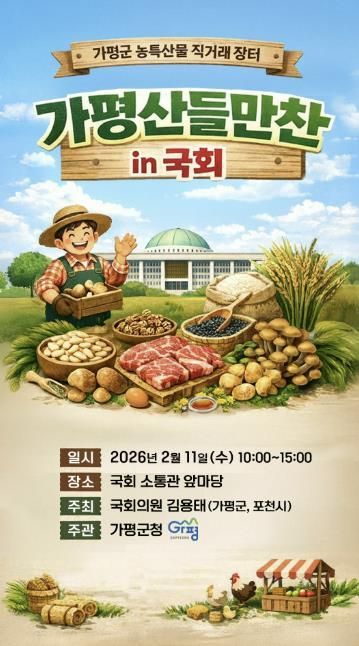가평군은 오는 11일 오전 10시부터 오후 3시까지 국회 소통관 앞마당에서 ‘가평산들만찬마켓 in 국회’ 농특산물 직거래 장터를 개최한다고 밝혔다. 이번 행사는 김용태 국회의원실이 주최하고 가평군이 주관한다.