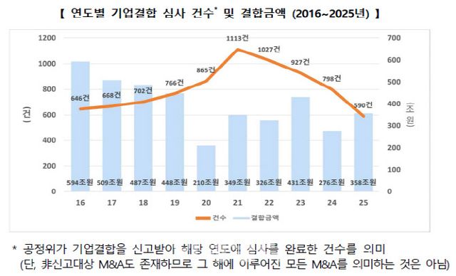 4일 공정위가 발표한 ‘2025년 기업결합 심사 동향’에 따르면 지난해 공정위가 심사한 기업결합 건수는 전년 대비 208건(26.1%) 감소한 590건으로 집계됐다. 같은 기간 금액은 82조원(29.7%) 증가한 358조 3000억원에 달했다.