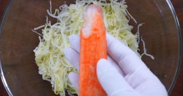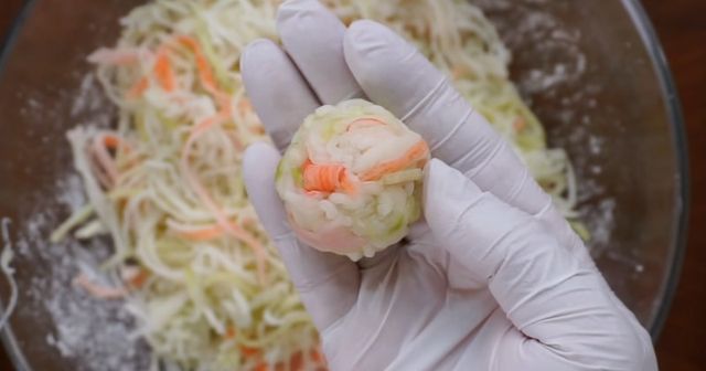 게 맛살은 결을 따라 잘게 찢어 무와 섞는다. 무와 게 맛살의 비율은 비슷하게 맞추는 것이 좋다. 여기에 감자전분가루를 소량 넣어 재료를 묶어준다. 밀가루보다 감자전분이 가볍고 깔끔한 식감을 만든다. 너무 많이 넣으면 떡처럼 질어질 수 있다.