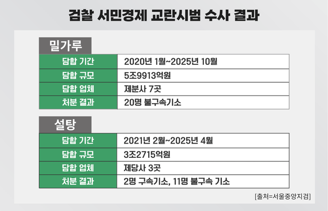 검찰 조사 결과 이번 담합 사건의 규모는 밀가루 약 5조9913억원, 설탕 약 3조2715억원, 한국전력 설비 입찰 담합 약 6776억원으로 총 9조9404억원에 달했다. 밀가루 담합은 2020년 1월부터 2025년 10월까지 약 5년 9개월, 설탕 담합은 2021년 2월부터 2025년 4월까지 약 4년 2개월 동안 가격 인상 시기·폭을 사전에 조율한 혐의를 받는다.