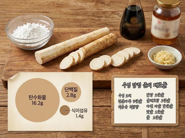 우엉은 겨울이 제철인 뿌리채소다. 저장성이 좋아 겨울 내내 가격 변동이 크지 않고, 식이섬유가 풍부해 포만감이 높다. 기름에 튀기면 수분이 빠지며 조직이 단단해져 씹는 맛이 강해진다. 이 특성이 강정 조리와 맞물리면서 고구마튀김이나 감자튀김과는 다른 방향의 식감을 만든다.
