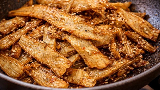 조리는 튀김과 볶음의 중간 단계다. 기름에 완전히 잠기지 않아도 된다. 팬에 기름을 자작하게 두르고 우엉을 넣어 노릇하게 익히듯 튀긴다. 색이 진해지면 건져내 기름을 뺀다. 이 상태만으로도 바삭한 우엉 스낵처럼 먹을 수 있다.
