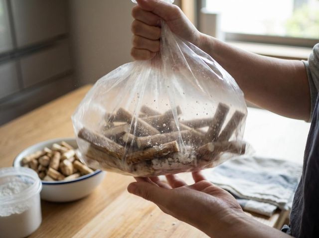 물기를 제거한 뒤 전분 코팅을 한다. 비닐봉지에 우엉과 전분가루를 넣고 흔들면 얇고 고르게 묻는다. 두껍게 입힐 필요가 없다. 얇은 전분층이 튀기는 과정에서 수분을 잡아주고 바삭함을 만든다.