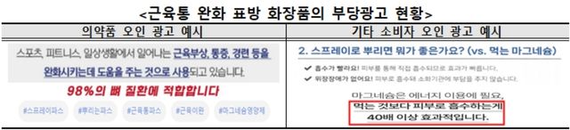 조사 대상은 분사형 10개, 크림제 10개로 구성됐으며, 조사 결과 전체의 85%인 17개 제품이 제품 설명서 또는 온라인 판매 페이지에서 소비자가 의약품으로 착각할 수 있는 표현을 사용한 것으로 나타났다. 이들 제품은 ‘파스’, ‘근육 부상 완화’ 등 의약품을 연상시키는 단어를 직접 사용하거나, ‘마그네슘을 피부로 흡수하는 것이 효과적’이라는 문구까지 명시해 광고했다.