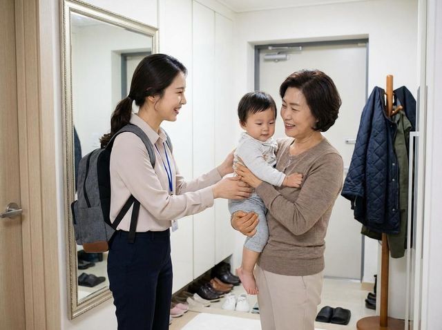 '출근하는 여성과 손주 돌봐주는 할머니'. 기사 내용 토대로 AI툴 활용해 제작한 자료사진.