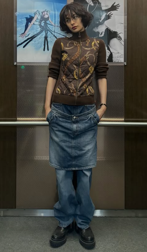 사진 속 나나는 짙은 갈색 저지를 입고 거울 앞에 서 있다. 특히 눈에 띄는 부분은 하의다. 통이 넓은 청바지를 위에 청치마를 겹쳐 입는 독특한 방식을 선택했다. 여러 겹을 겹쳐 입은 옷차림에도 불구하고 나나의 큰 키와 마른 몸매가 돋보인다.