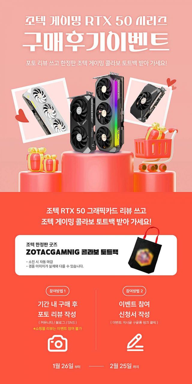 지포스 그래픽카드 전문 기업 조텍코리아가 RTX 50 시리즈 그래픽카드 구매 고객을 대상으로 2월 구매 후기 이벤트를 진행한다.