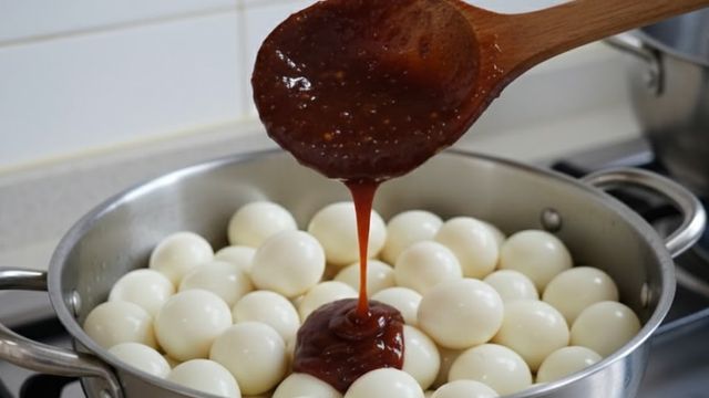 메추리알에 비법 양념장을 넣는 모습. 영상 속 장면을 AI로 재생성한 이미지.
