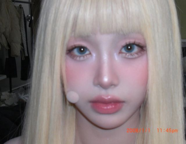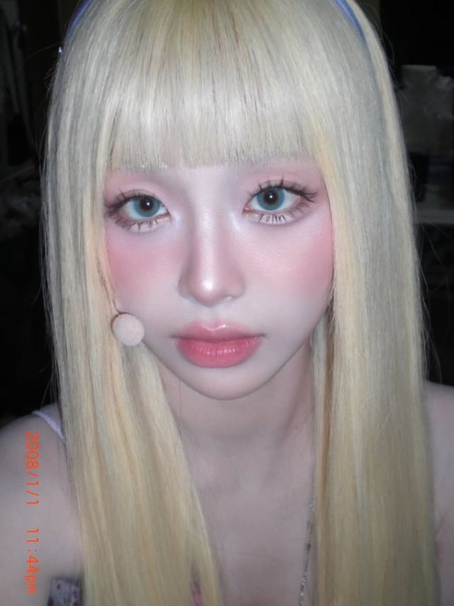 사진 속 츄는 금발 헤어에 파란색 컬러 렌즈를 매치해 AI를 연상케 하는 비주얼을 완성했으며, 블러셔와 글리터 메이크업으로 몽환적인 분위기를 더했다.