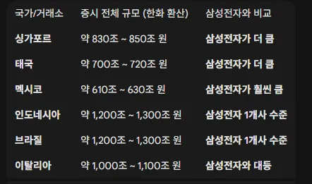 싱가포르: 국가 전체 상장사 다 합쳐도 800조 중반임. → 삼전 승