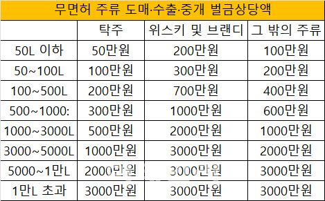 개정안에 따르면 면허 없이 술을 수출하거나 중개한 경우 주류의 종류와 양에 따라 50만원에서 최대 3000만 원까지 벌금상당액이 부과된다. 예를 들어 탁주(막걸리)의 경우 50L 이하는 50만원이지만, 1만L를 초과하면 3000만원을 내야 한다. 단가가 높은 위스키나 브랜디는 소량이라도 더 엄격한 잣대가 적용돼 최대 부과액인 3000만원에 도달하는 속도가 훨씬 빠르다.