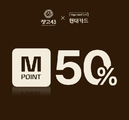 전국 창고43 매장에서 현대카드로 결제하는 고객은 구매 금액의 최대 50%까지 M포인트를 사용할 수 있다. M포인트는 1000포인트부터 자유롭게 사용할 수 있으며, 창고43의 모든 식사 메뉴에 적용 가능하다.