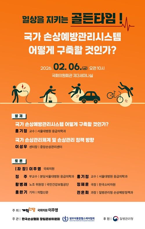 토론회를 주최하는 이주영 의원은 “진정한 의미의 골든타임은 사고 발생 직후뿐 아니라 사고 이전 위험을 감지할 수 있는 선제적 시간을 포함하는 것”이라며 “이번 토론회를 통해 분절적으로 운영되던 손상 감시체계를 통합하고 사고 이전과 이후를 아우르는 관리 체계 구축 역량을 지속적으로 강화해 나가길 바란다”고 기대를 표했다.