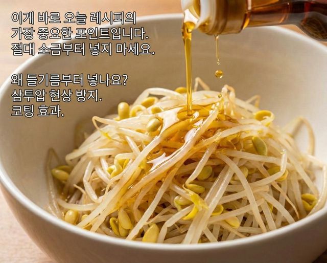 양념 단계에서 가장 중요한 포인트는 들기름을 가장 먼저 넣는 것이다. 들기름을 먼저 넣어 가볍게 버무리면 콩나물 겉면에 기름막이 형성된다. 이 코팅층이 수분 이탈을 막아주는 역할을 한다. 그 다음에 소금을 넣어도 삼투압으로 인한 급격한 수분 배출이 크게 줄어든다.