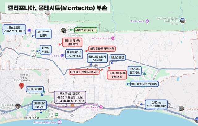 로스앤젤레스에서 차로 약 90분 떨어진 캘리포니아 몬테시토(Montecito)는 미국을 대표하는 '은둔형 부촌'으로 분류된다. 태평양을 마주한 해안과 산타 이네즈 산맥을 등진 배산임수 지형, 스페인 식민지 시대의 건축 전통이 결합된 이 지역은 외부 노출을 최소화한 주거 환경을 특징으로 한다. 할리우드 중심부와 일정 거리를 유지하면서도 최고 수준의 주거 인프라를 갖춘 몬테시토는 프라이버시를 중시하는 글로벌 상류층이 장기 거주지로 선택하는 대표적 공간으로 자리 잡고 있다.
