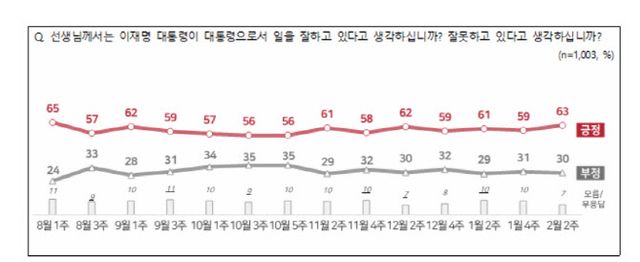 국정 신뢰도도 비슷한 흐름이었다. 이 대통령의 국정 운영을 ‘신뢰한다’는 응답은 62%였다. ‘신뢰하지 않는다’는 33%였다. 진보층과 중도층에서는 ‘신뢰한다’ 비율이 높았다. 보수층은 ‘신뢰하지 않는다’ 비율이 높았다.
