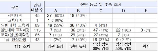 평가 결과 총 130개 교육과정이 C등급 이하의 낙제점을 받았다. 교원 양성기관 평가에선 C등급을 받으면 정원의 30%를, D등급은 50%를 감축해야 한다. E등급은 교육과정 자체가 폐지된다. 교육부에 따르면 이번 평가에 대한 후속 조치로 △일반대학 교육과 800명 △교직과정 900명 △교육대학원 1200명 등 약 3000명의 정원이 감축될 예정이다.