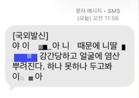 그러자 신변에 위협을 느낄만할 일이 발생했다. 곧장 A씨 아내, 즉 B양 엄마에게 협박 문자가 날아들었다. 자신의 번호를 감추고 해외에서 발송한 것으로 위장한 문자에는 심한 욕설과 함께 B양을 성폭행하고 염산 테러를 하겠다는 내용이 담겼다.