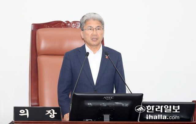 이 의장은 5일 제주도의회 제446회 임시회 제1차 본회의 개회사에서 올해 6월 지방선거 때부터 교육의원 제도가 폐지되면서 불거진 제주도의원 정수 감축 문제에 대해 "도의회는 제주특별법에 따라 5300여 건의 방대한 특례 사무를 다루고 있다"며 "이러한 고도의 특수성과 업무의 복잡성을 고려할 때 별도의 대안 없는 의원 정수 감축은 의회의 견제·감시 기능을 위축시킬 우려가 있다"고 지적했다.