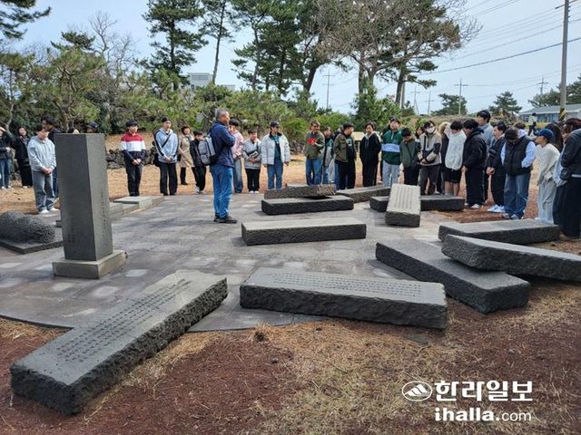 제주 다크투어리즘 유명 장소 중 하나인 제주시 조천읍 북촌리의 '순이 삼촌' 문학비 탐방. 한라일보 DB