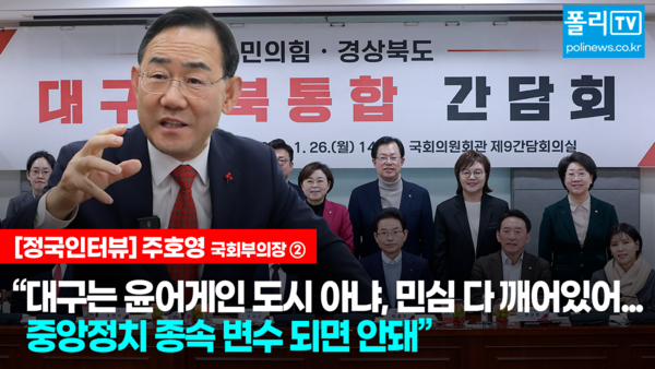 주 부의장은 이날 오후 여의도 국회에서 폴리뉴스 김능구 대표와 진행한 정국인터뷰 겸 2026 지방선거 후보 인터뷰에서 "외부에서 볼 때 우리 대구·경북이 윤어게인 경향이 강하다든지 계엄이 잘 됐다든지, 이런 주장을 하는 도시로 비쳐서는 안 된다"며 이같이 말했다.