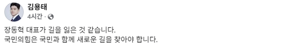 김용태 의원은 간결하게 이날 오후 자신의 SNS를 통해 "장동혁 대표가 길을 잃은 것 같습니다. 국민의힘은 국민과 함께 새로운 길을 찾아야 합니다"라고 밝혔다.