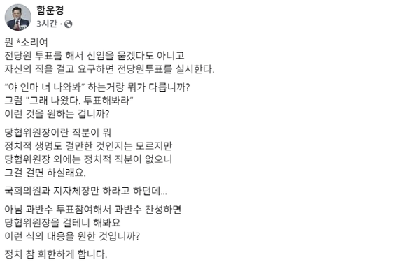 함 위원장은 이날 오후 자신의 SNS를 통해 "전당원 투표를 해서 신임을 묻겠다도 아니고 자신의 직을 걸고 요구하면 전당원 투표를 실시한다"며 "'야 인마 너 나와봐' 하는 거랑 뭐가 다릅니까"라고 반문했다.