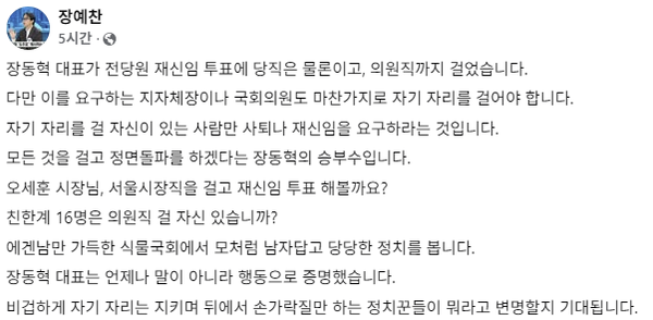 그는 "모든 것을 걸고 정면돌파를 하겠다는 장동혁의 승부수입니다"라며 "오세훈 시장님, 서울시장직을 걸고 재신임 투표 해볼까요"라고 도발했다.