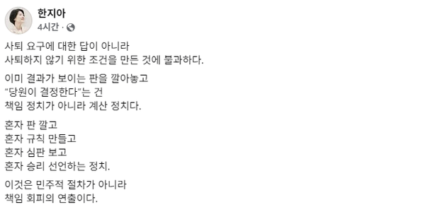 한 의원은 "사퇴 요구에 대한 답이 아니라 사퇴하지 않기 위한 조건을 만든 것에 불과하다"며 "이미 결과가 보이는 판을 깔아놓고 '당원이 결정한다'는 건 책임 정치가 아니라 계산 정치다"라고 비판했다.