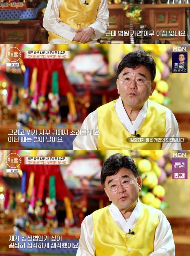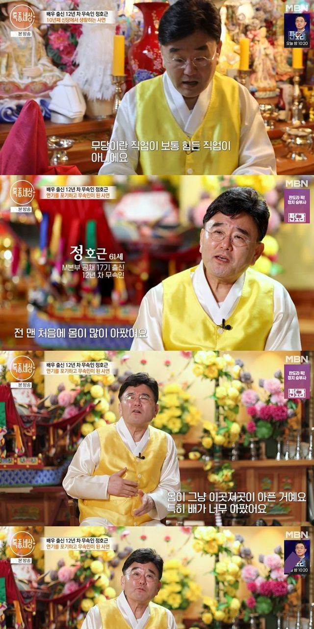 5일 방송된 MBN '특종세상'에는 드라마 '왕초' '상도' '정도전' 등에서 강렬한 악역으로 얼굴을 알린 정호근이 무속인의 길을 걷게 된 사연을 밝혔다.