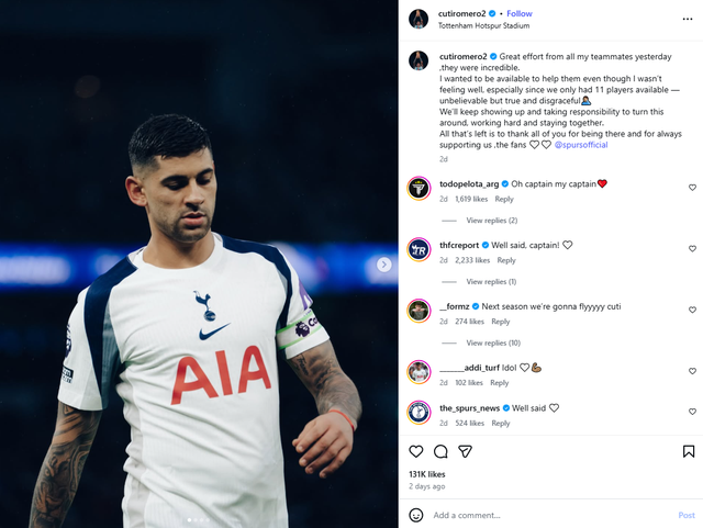 해당 발언은 단순한 경기 소감이 아닌, 반복되는 부상 악재와 겨울 이적시장 보강 실패에 대한 구단 운영 전반을 겨냥한 공개 비판으로 해석됐다. 실제로 로메로의 게시물에는 일부 동료 선수들이 '좋아요'를 누르며 공감의 뜻을 드러냈고, 이는 내부적으로도 문제의식이 공유되고 있음을 시사했다.