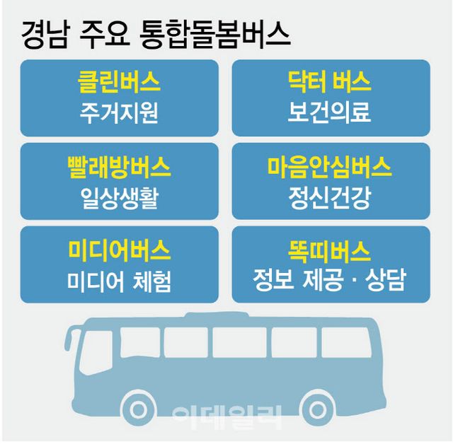 이 밖에도 자활기업이 저장강박증을 겪는 주거 취약계층을 대상으로 집 정리 서비스를 제공한다. 경남자활센터는 대형 이불과 빨래를 무료로 세탁해주는 ‘빨래방 버스’를 운영 중이다. 병원선, 닥터버스, 무료진료버스, 찾아가는 산부인과, 마음안심버스까지 포함하면 경남 지역에서 운영되는 통합돌봄 버스는 10여 종에 달한다.