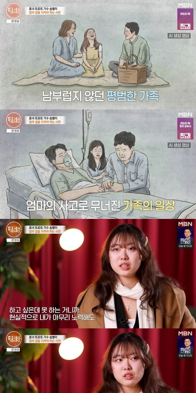 송별이는 "언젠가 내가 꼭 성공하게 되면 '엄마 아빠랑 제주도에 멋진 집 하나 지어서 같이 살고 싶다' 이런 생각을 자주 했다. 빨리 건강해져서 저 공연할 때도 편하게 보러 오시고, 만약에 잘되면 같이 집도 짓고 해서 잘 살았으면 좋겠다"고 힘찬 바람을 드러냈다.