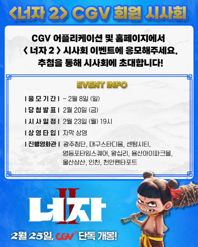 CGV 회원들을 대상으로 하는 이번 시사회는 광주첨단, 대구스타디움, 센텀시티, 영등포타임스퀘어, 왕십리, 용산아이파크몰, 울산삼산, 인천, 천안펜타포트 등 전국 7개 도시 10개관에서 진행된다. 응모 기간은 오는 8일까지로, CGV 애플리케이션과 홈페이지에서 응모가 가능하며 자막판으로 상영이 예정돼 있다. 이 외에도 패밀리 관객에서 성인 관객 그리고 애니 마니아 관객까지 더빙과 자막판을 선택해 만날 수 있는 시사들이 계속될 예정이다. 개봉까지 입소문 릴레이 시사를 계속 진행할 ‘너자 2’는 이달 25일 극장 개봉한다.