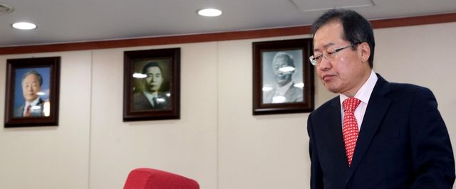 국민의힘 전신인 자유한국당 시절인 2017년 11월 당시 홍준표 당 대표가 서울 여의도 당사에서 열린 최고위원회의에 참석하며 이승만, 박정희, 김영삼 전 대통령 사진이 걸린 벽 앞을 지나고 있다. / 뉴스1